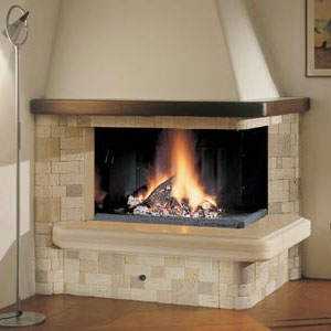 Угловой камин, выполненный из кусков мрамора Travertino, образующих мозаику; столешница из Stonelite Avorio, верхняя балка из дерева.